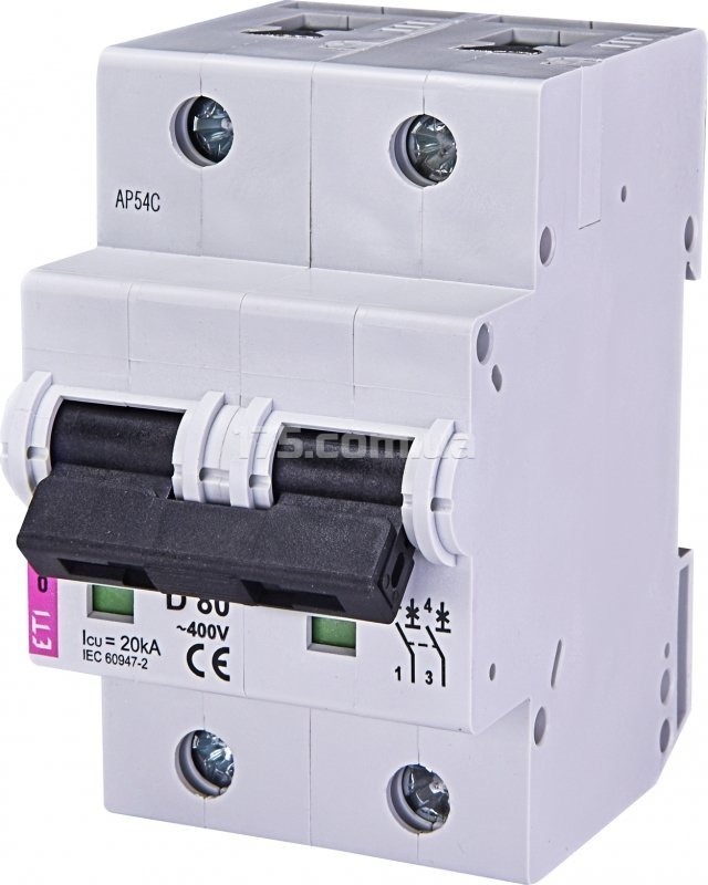 Модульный автоматический выключатель ETIMAT 10 2p D 80А (20 kA) ETI двухполюсный на 80А с характеристикой отключения D. Отключающая способность ( максимальный ток короткого замыкания) 20кА. Скрепится на DIN рейку (ТН 35) в стандартный модульный щиток. Серия ETIMAT 10 имеет возможность монтировки дополнительных аксесуаров: блок контактов,независимый расцепитель минимального напряжения. Токоведущие части надежно защищены от прикосновения. Разьемы для фазной шины есть как сверху так и снизу, что дает дополнительно удобство для монтажа. Автоматы ETIMAT 10 на 80А, 100А, и 125 А имеют увеличеный корпус 27 мм (1,5 стандартных модуля). Концерн "ETI Elektroelement" основан более 60 лет назад. Сегодня ETI является одним из мировых лидеров среди производителей электротехнической продукции, имеет заводы в Словении и по всей Европе.