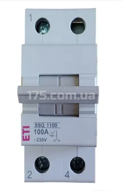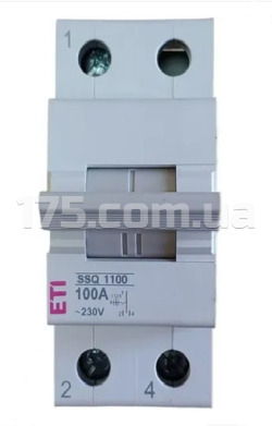 Single-pole switch SSQ 1100 with "1-0-2" positions for manual switching between two power sources. Rated at 100A. Suitable for high-load systems, reliable and easy to install.