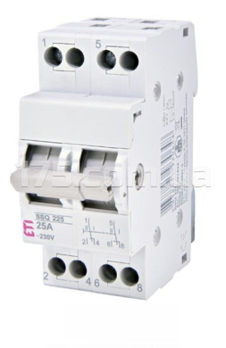 Переключатель нагрузки SSQ 225 "1-0-2", 2 полюса, 25А Надёжный двухполюсный переключатель нагрузки с положениями "1-0-2" для ручного управления цепями. Обеспечивает безопасное переключение между двумя источниками питания или режимами работы. Номинальный ток — 25 ампер. Идеален для промышленных и бытовых электрических систем.
